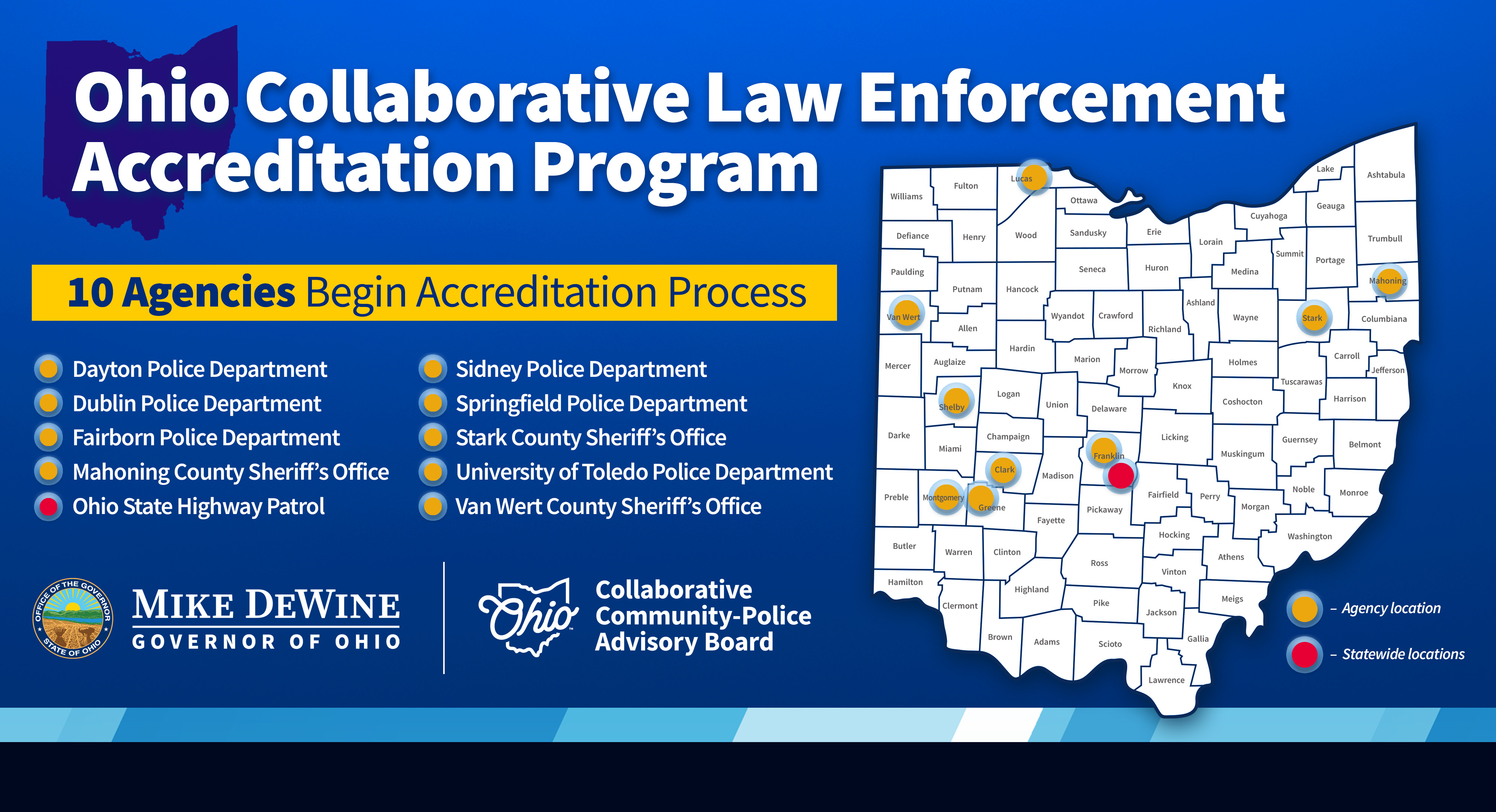 “You can’t put a price on professionalism in public service,” said Governor DeWine. “Every citizen in Ohio deserves to live in a community where its police force is guided by the highest standards of integrity, accountability, and excellence. Accreditation instills public trust and confidence in policing practices, and by offering this new program for free, we’re making accreditation attainable for all agencies no matter how big or small.”