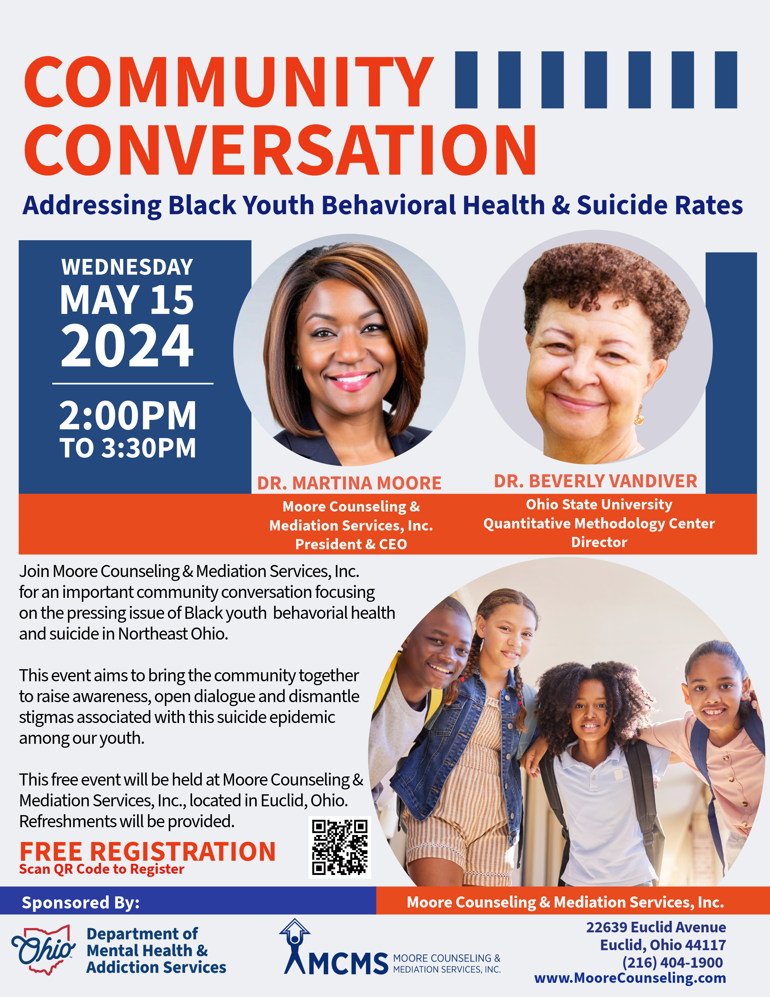 Moore Counseling & Mediation Services, Inc., with support from OhioMHAS, will host a Community Conversation: Addressing Black Youth Behavioral Health and Suicides Rates event on May from 2:00-3:30 p.m. at MCMS' offices in Euclid. This event aims to bring the community together to raise awareness, open dialogue, and dismantle stigmas associated with this suicide epidemic among our youth. The presentation will feature remarks from Dr. Martina Moore, President and CEO of Moore Counseling & Mediation Services, Inc., and Dr. Beverly Vandiver, Director of The Ohio State University Quantitative Methodology Center.