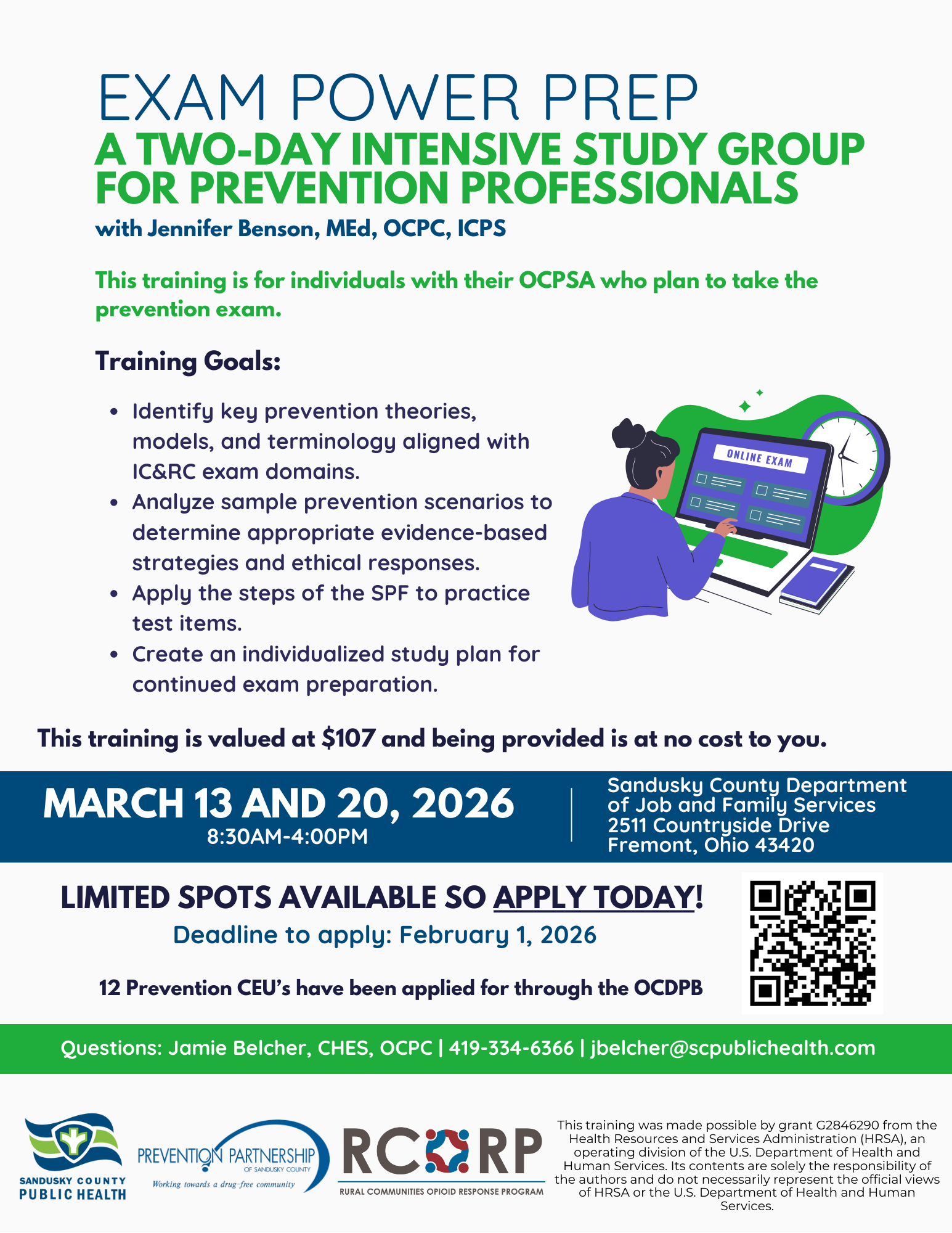 Sandusky County Public Health is hosting a two-day, in-person OCPS test prep study group on March 13 and March 20 from 8:30 a.m. to 4:00 p.m. in Fremont. This training is for individuals with their OCPSA who want to take the Ohio prevention exam to obtain their OCPS. Due to funding sources, applicants in Ottawa, Sandusky, Wyandot, Huron, and Seneca Counties, and those in Northwest Ohio will be given priority, but anyone interested is encouraged to apply. Seating is limited. The deadline to apply is Feb. 1. Questions? Email jbelcher@scpublichealth.com.