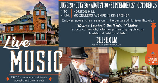 On the last Saturday of June, July, August, September, and October, from 1 to 3 p.m., The Chisholm will present a series of jam sessions in the parlor room of Horizon Hill, the home of Territorial Governor A. J. Seay. Wayne Cantwell, “the Flyin’ Fiddler,” will lead the old-fashioned jam sessions in the parlor of Horizon Hill. Musicians of all levels are encouraged to participate in this excellent learning opportunity to sit and play alongside seasoned performers! For more information, contact the museum at 405-375-5176.
