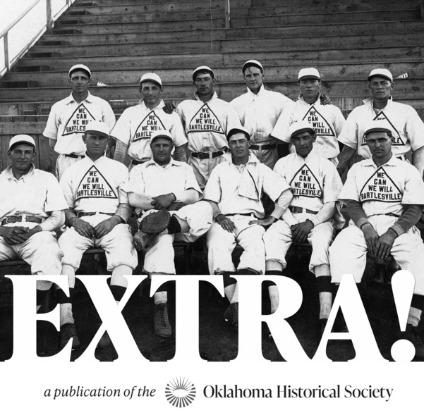 Masthead image: 1908 Pennant Winners, Bartlesville, Oklahoma. Triangular patches on the front of the team uniforms carry the encouragement "We Can, We Will, Bartlesville" (152.4, Howard Sharp Collection, OHS). |