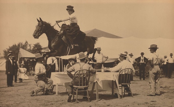 The photo above, of Mabel Hackney Tompkins performing at a Wild West show with her horse Sky Rocket, shows her adept skills as a rider—she is clearing the table with precision while wearing a dress and riding sidesaddle. Tompkins developed the act by seating several gentlemen at the table, instructing them to act as though they were enjoying a beverage while she and the horse made the jump. At the time, she and her husband Charles Harland Tompkins were featured performers on the eastern fair circuit, which traveled through major cities in the eastern half of the United States.(2) The couple operated their own Wild West show from 1912 to 1917.