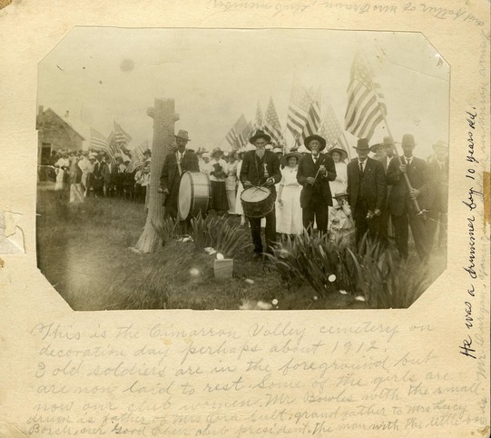 "This is the Cimarron Valley cemetery on decoration day perhaps about 1912. 3 old soldiers are in the foreground, but are now laid to rest. Some of the girls are now our club women. Mr. Bowles with the small drum is father of Mrs. Ora ------; grandfather to Mrs. Lucy Borch, our Good Cheer club president. The man with the little boy is Mr. Durgan, youngest soldier in Union Army, and father of Mrs. Crain, club member. He was a drummer boy 10 years old" (2015.239.2440, Sons and Daughters of the Cherokee Strip Collection, OHS).