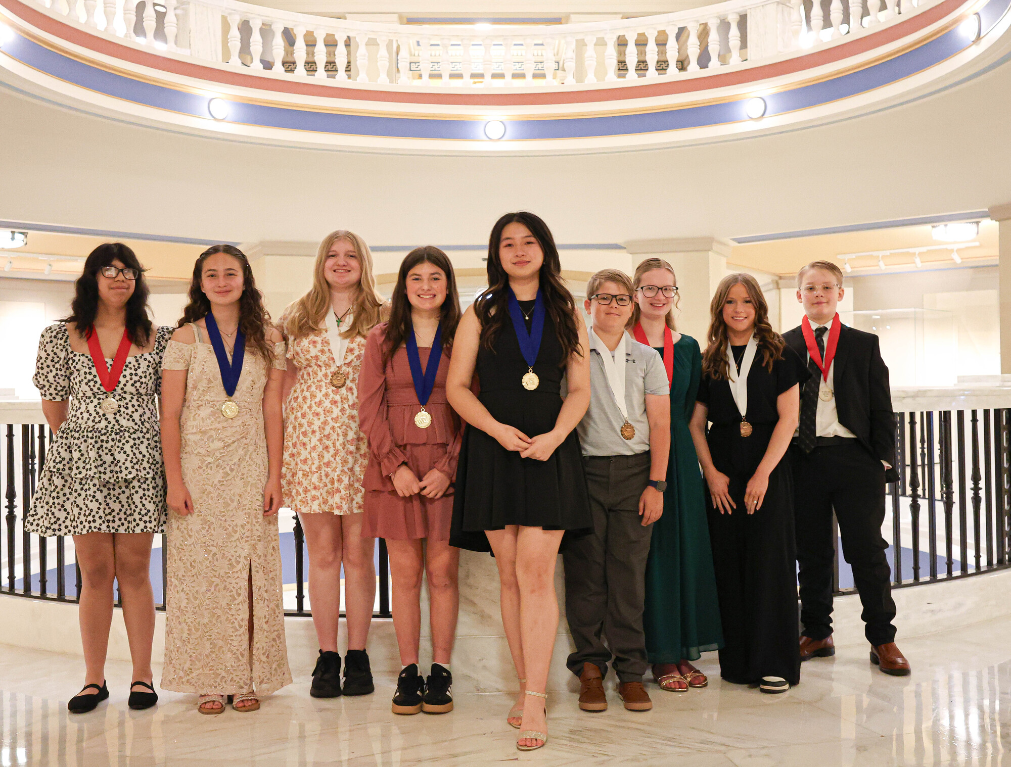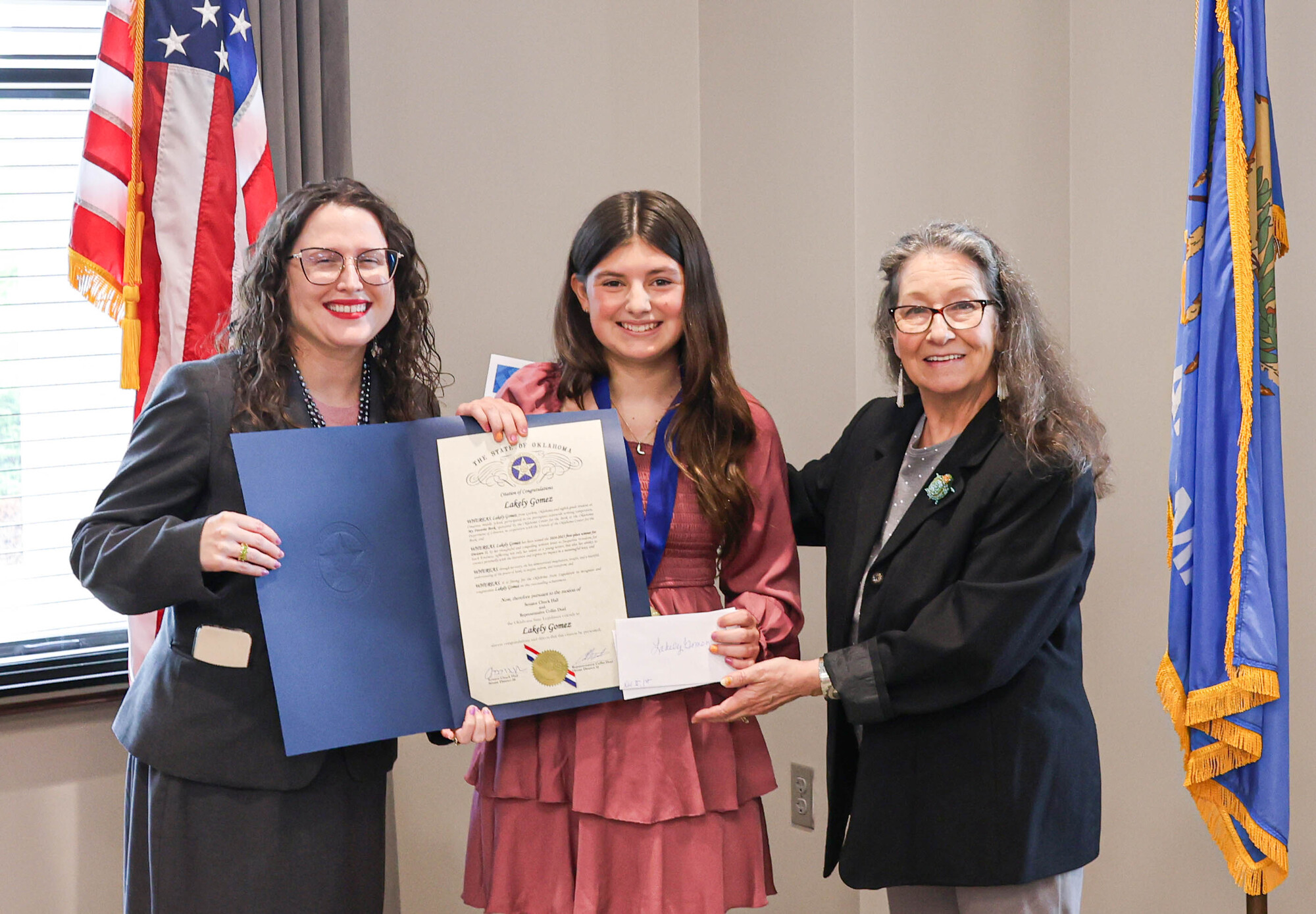 Contest winners pose at the State Capitol on May 7, 2025. FOCB President Kelley Riha (right) and I present first-place winner Lakely Gomez (middle) with her award and commendation letter from her legislators.