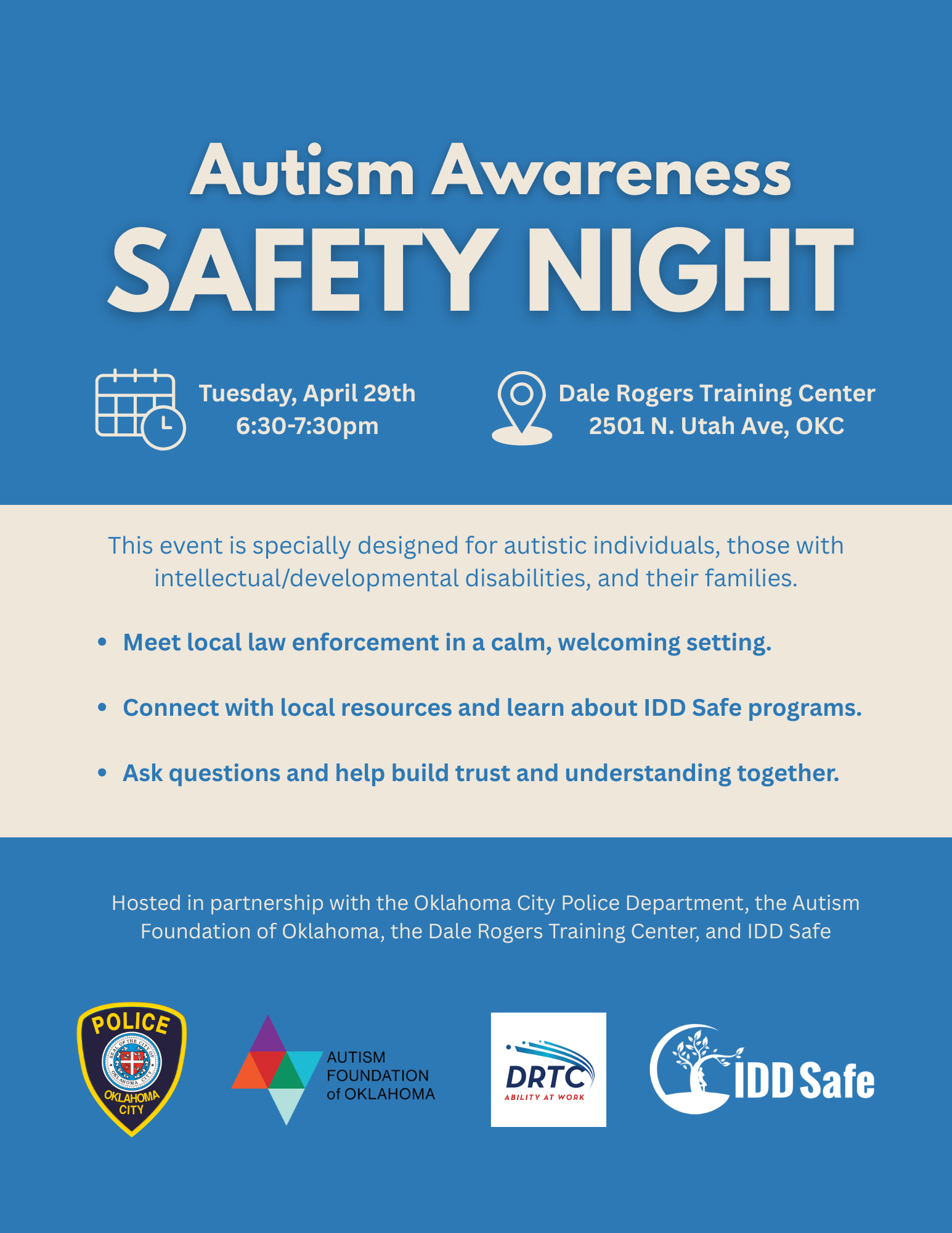 Autism Awareness Safety Night is hosted by Dale Rogers Training Center, IDD Safe, Autism Foundation of Oklahoma, and the Oklahoma City Police Department.