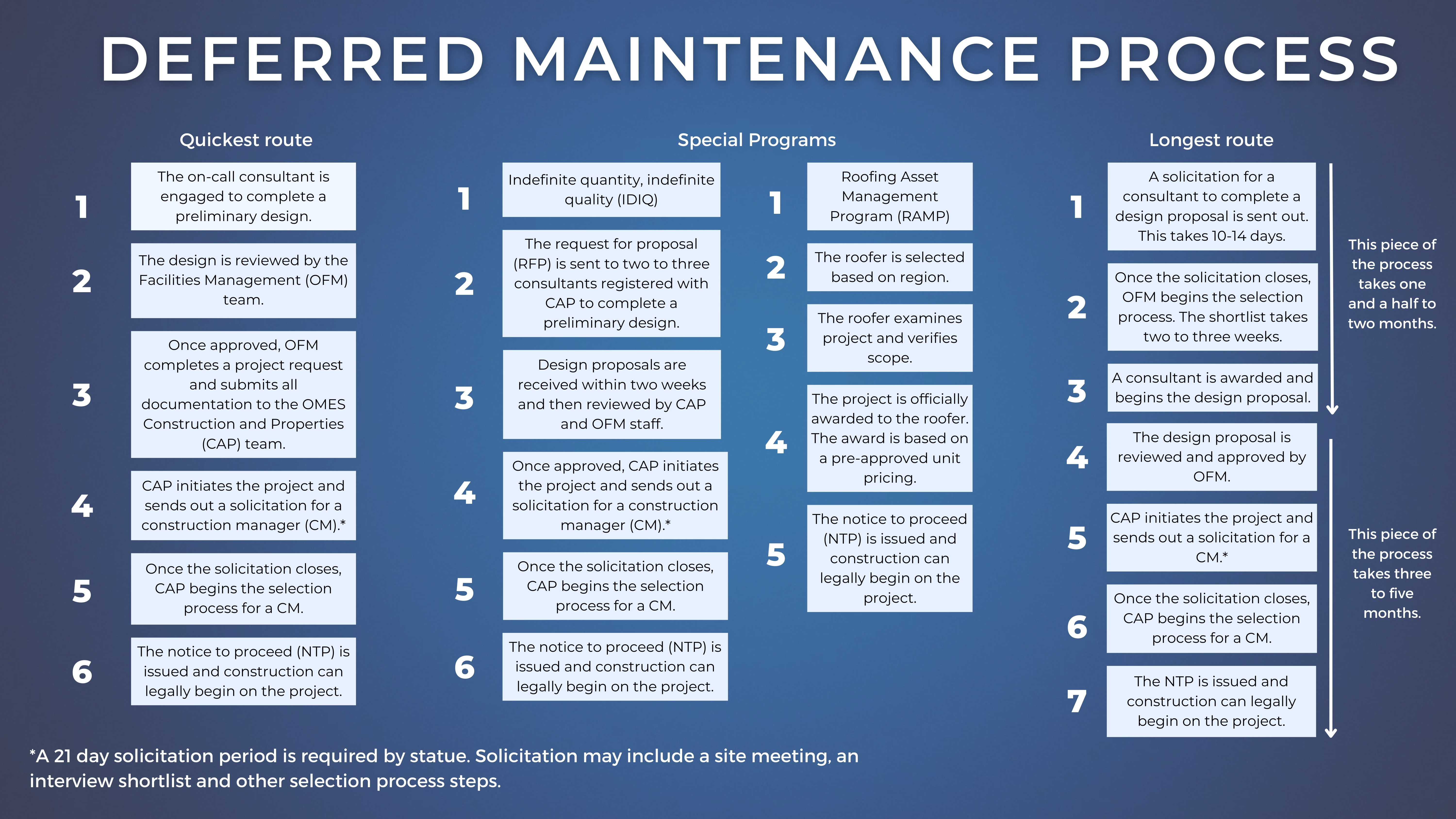There are three different process pathways that a deferred maintenance project can go through. The long route entails solicitations through the competitive bidding process and the fast-track pathway utilizes an on-call consultant to draft the project design and speed the process up. Lastly, there is the special programs pathway which utilizes OMES' Roofing Asset Management Program (RAMP) calling on preapproved roofers, or the Indefinite Delivery/Indefinite Quantity (IDIQ) program which utilizes preapproved architects, engineers and other consultants for quicker delivery of services. The process is outlined in this graphic: