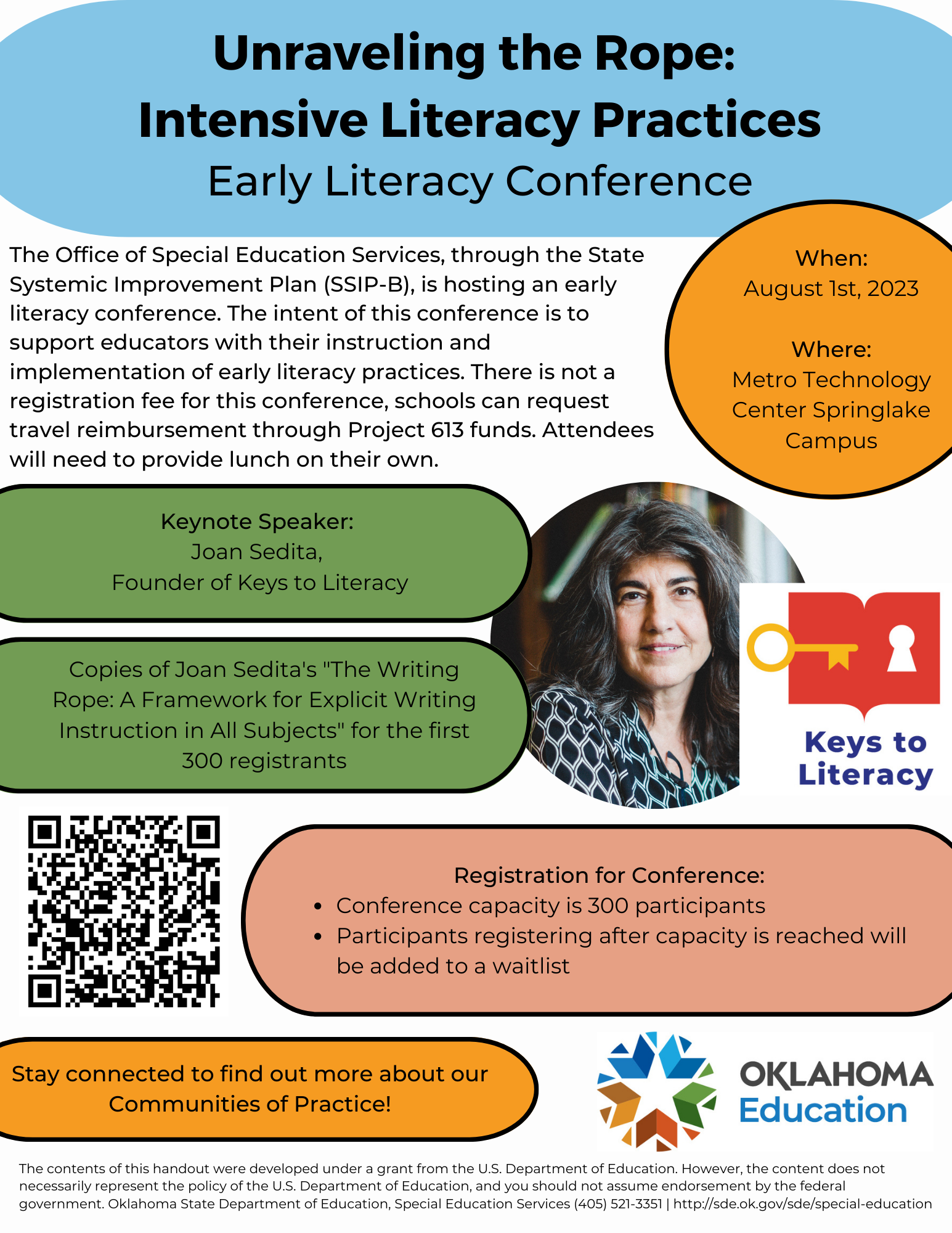 The Office of Special Education Services, through the State Systemic Improvement Plan (SSIP-B), is hosting an early literacy conference, Unraveling the Rope: Intensive Literacy Practices. This literacy conference is intended to support all educators who work with K-3 students specifically their early literacy instruction. This conference will be a one-day conference (8:30-4:00pm) held at Metro Technology Springlake in the OKC Metro on August 1st, 2023.