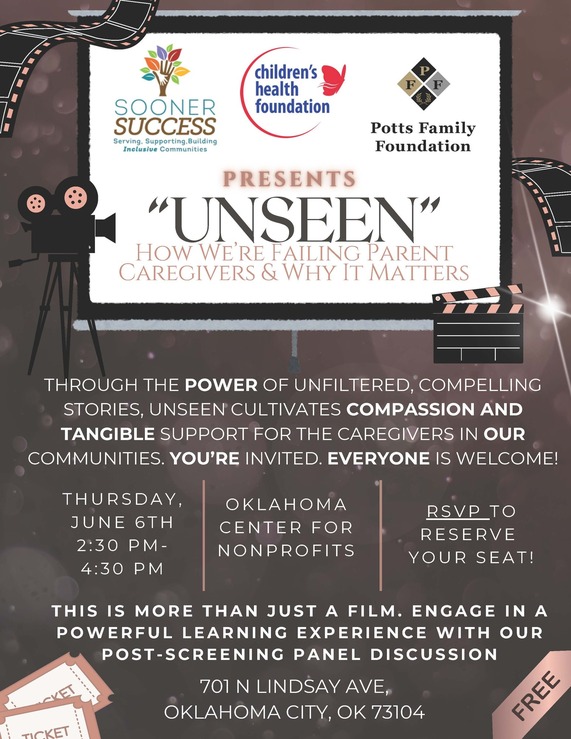Join the Potts Family Foundation, the Children’s Health Foundation, and Sooner SUCCESS on June 5, 2025 at 2:30 PM at The Center for Nonprofits for a special screening of Unseen, an eye-opening documentary that explores the vital, yet often overlooked, experiences of caregivers.