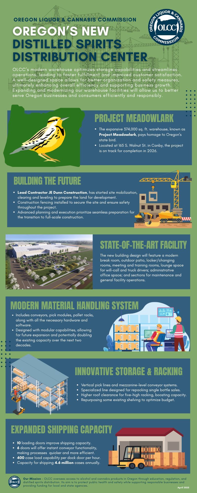 "Our current warehouse operates at capacity, creating logistical challenges, and risking revenue opportunities for the state,” said OLCC Executive Director Craig Prins. “This new facility, with its advanced material handling systems and expanded footprint, will allow us to better serve Oregon businesses and consumers efficiently and responsibly."