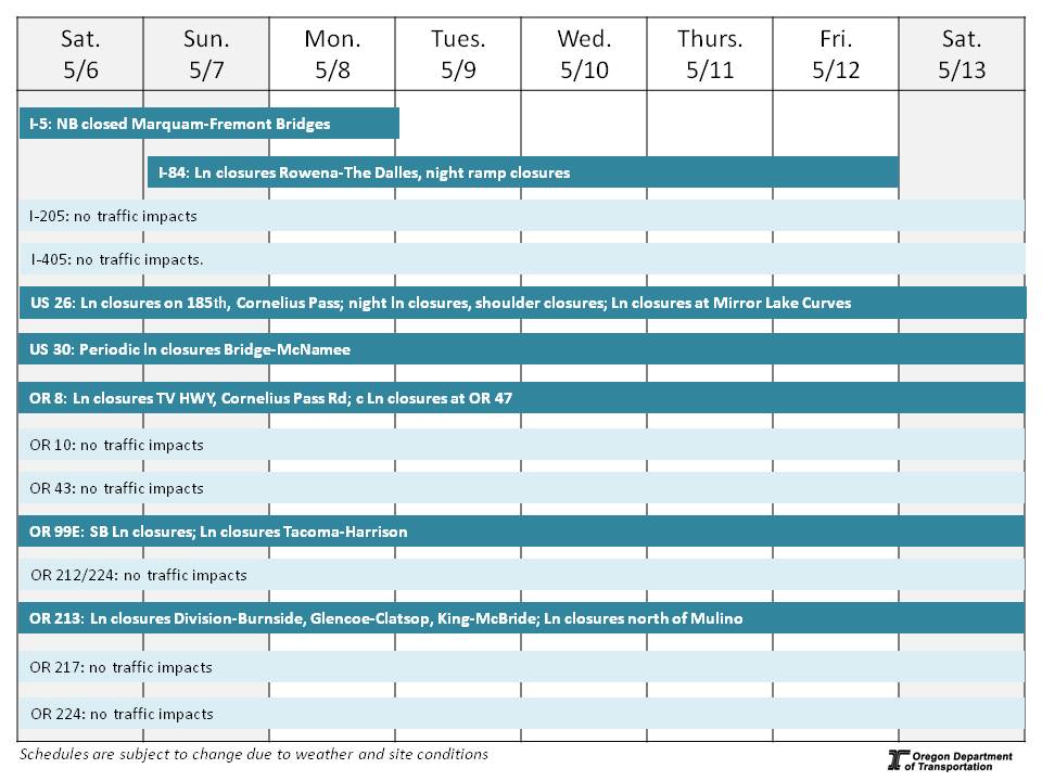 Traffic Impacts: Interstate 5 northbound is closed from 10 p.m. Friday to 4:30 a.m. Monday between the Marquam and Fremont Bridges. Closure includes some ramps.