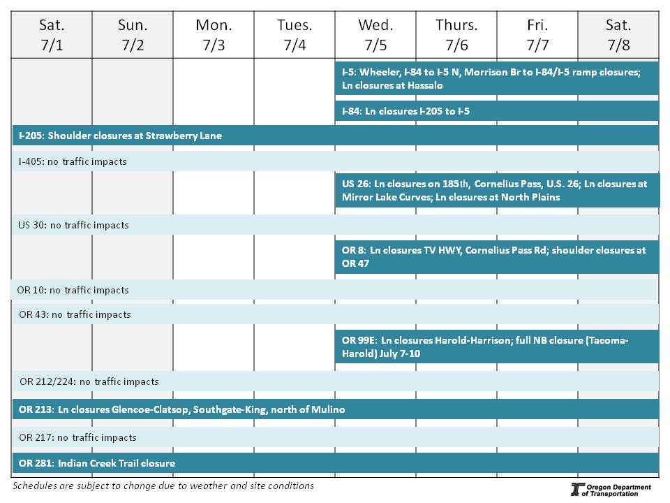 Traffic Impacts: Full closure of northbound OR 99E (Tacoma-Harold) from 10 p.m. Friday, July 7 until 5 a.m. Mon. July 10. Southbound open.