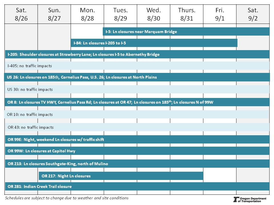 3. Review this "quick glance" schedule. Construction information is shown for one week in a visual format, giving you the most up-to-date information for targeted areas in the Portland-metro region.