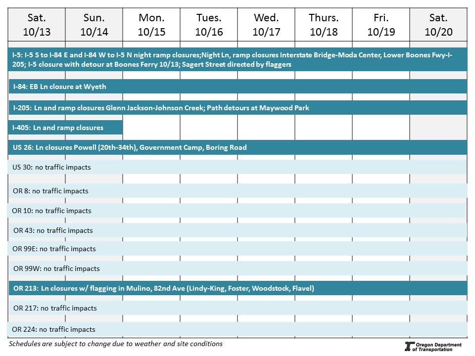 Traffic Impacts: Nighttime lane closures and ramp closures. Saturday night, Oct. 13 traffic in both directions will detour at Lower Boones Ferry Road using the off- and on-ramps.