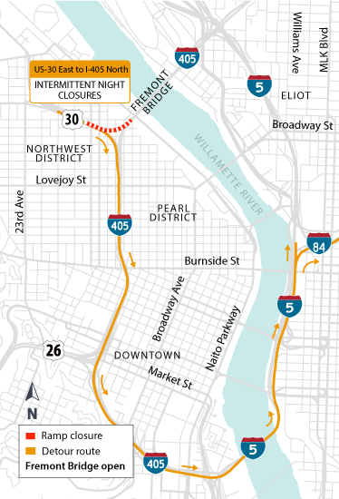 U.S. 30 to I-405 north and U.S. 30 to I-405 south will not close at the same time. Signs will direct drivers to detour routes shown below.