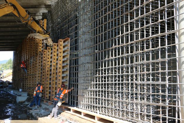 Crews stiffen the vertical supports on the Interstate 5, Scoville Road bridge at north Grants Pass Exit 58.