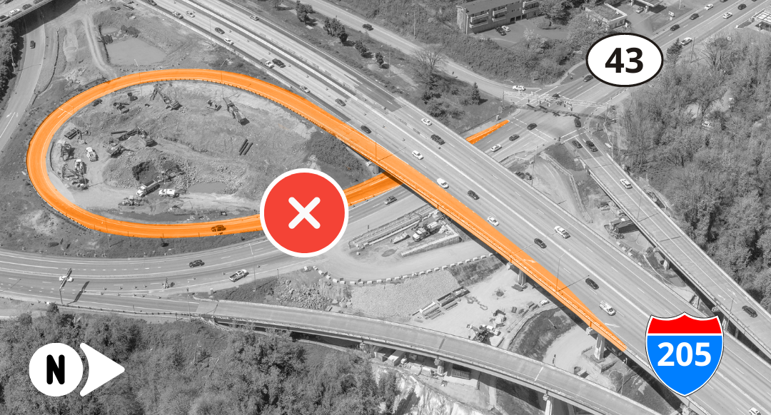 - Use southbound I-205 to Exit 6 (10th Street), then cross under the freeway to access northbound I-205. This detour has been used multiple times in the past.