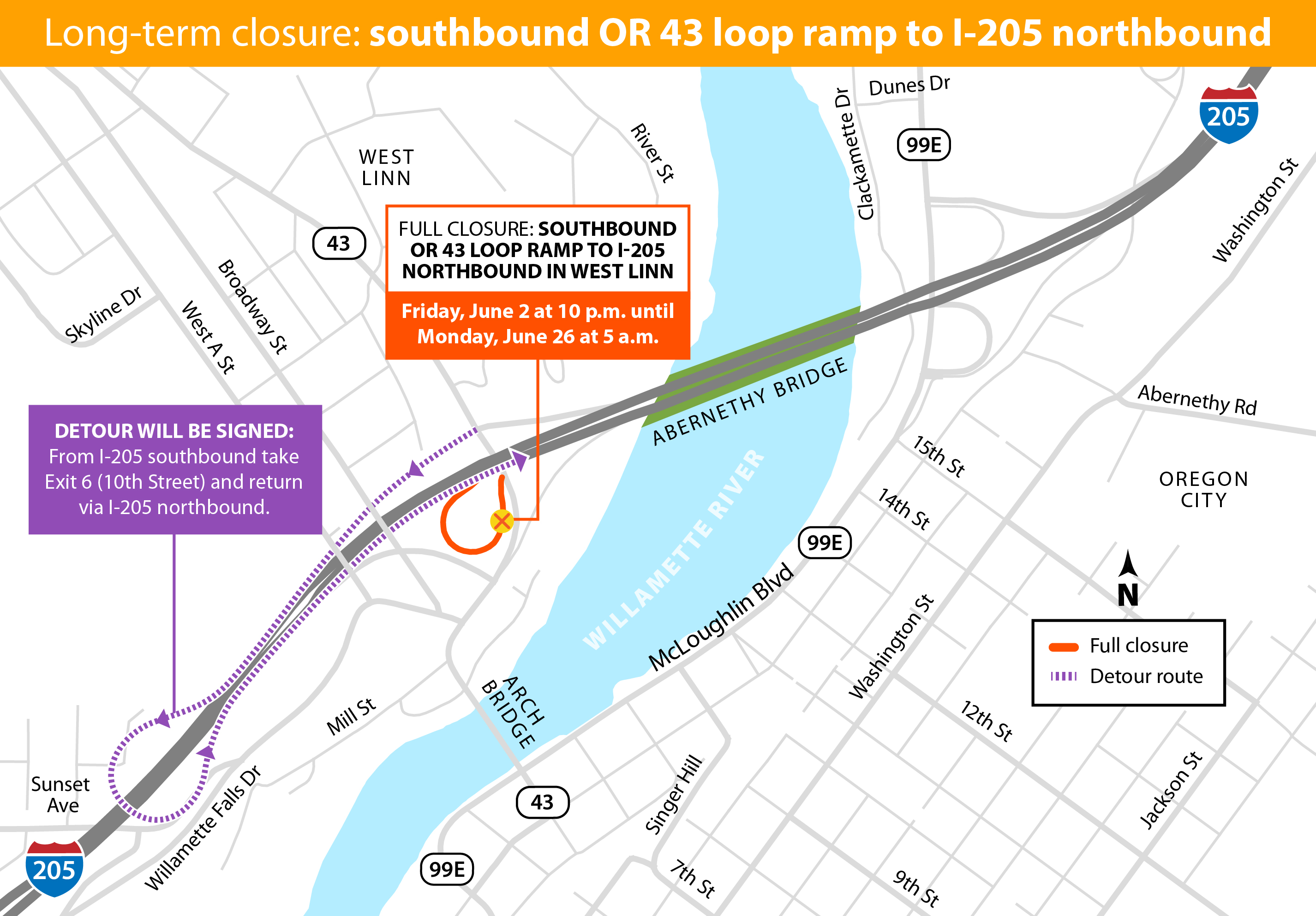 During this closure, drivers will follow a detour using southbound I-205 to Exit 6 (10th Street), then cross under the freeway to access northbound I-205.