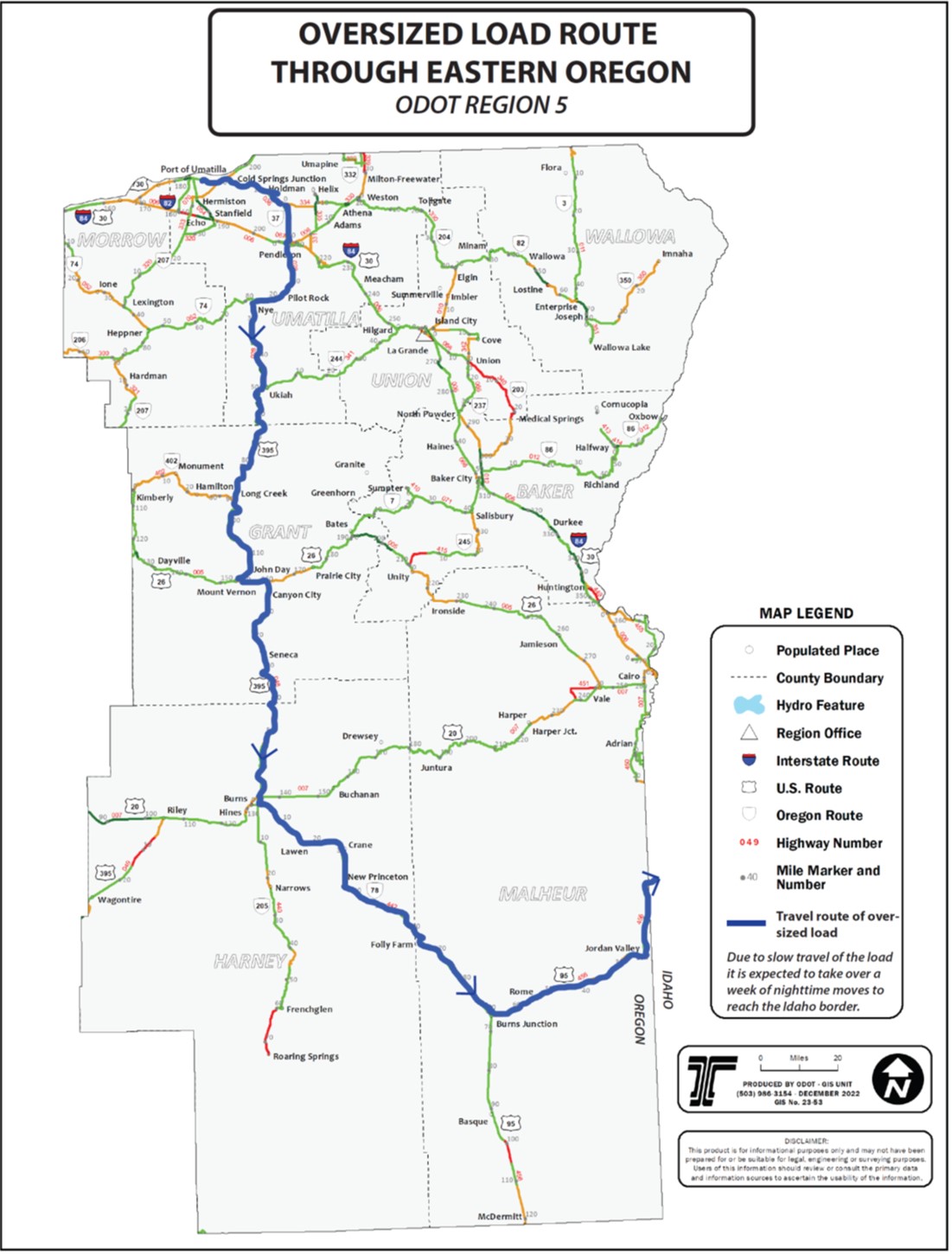 PENDLETON - Motorists should expect nighttime delays of up to 20 minutes starting June 12 and continuing for over a week on various eastern highways and local roads. These delays will accommodate an oversized transport scheduled to travel during eight or more evenings as it moves from north of Pendleton to the Idaho border. The shipment consists of boiler equipment and is expected to travel 5 to 30 mph along segments of OR 37, Interstate 84 in Pendleton, U.S. 395, U.S. 26, U.S. 20, OR 78, U.S. 95 and other roads in Umatilla, Grant, Harney and Malheur counties. It will exit Oregon into Idaho via U.S. 95 north of Jordan Valley (see attached map).