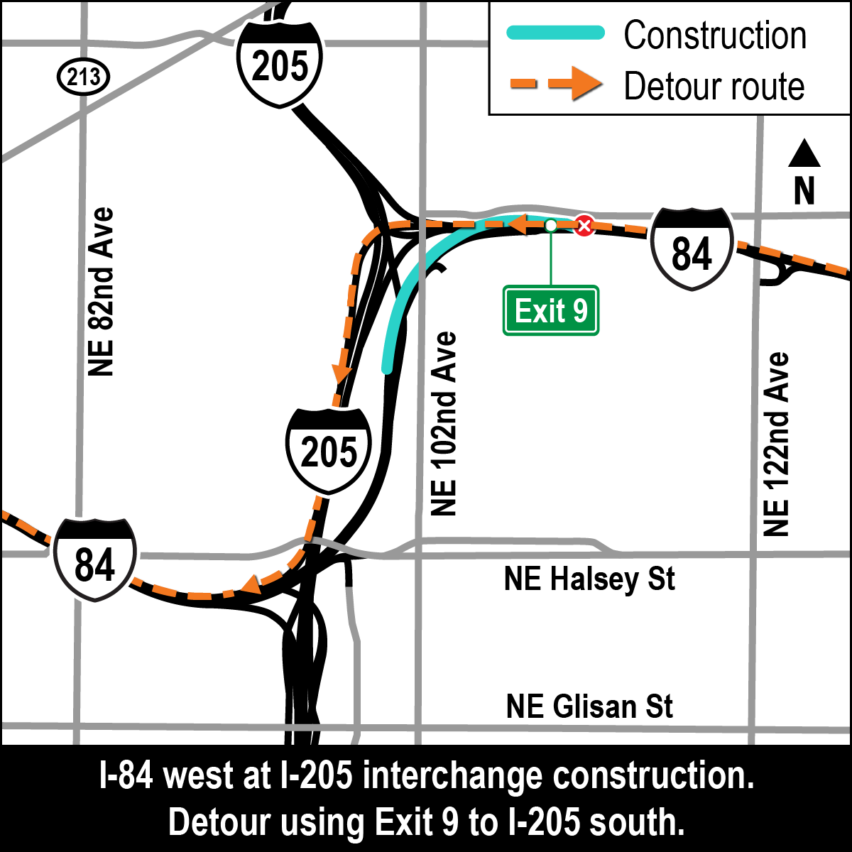 - Several nighttime detours of I-84 east and west (one direction at a time) at I-205 in September.