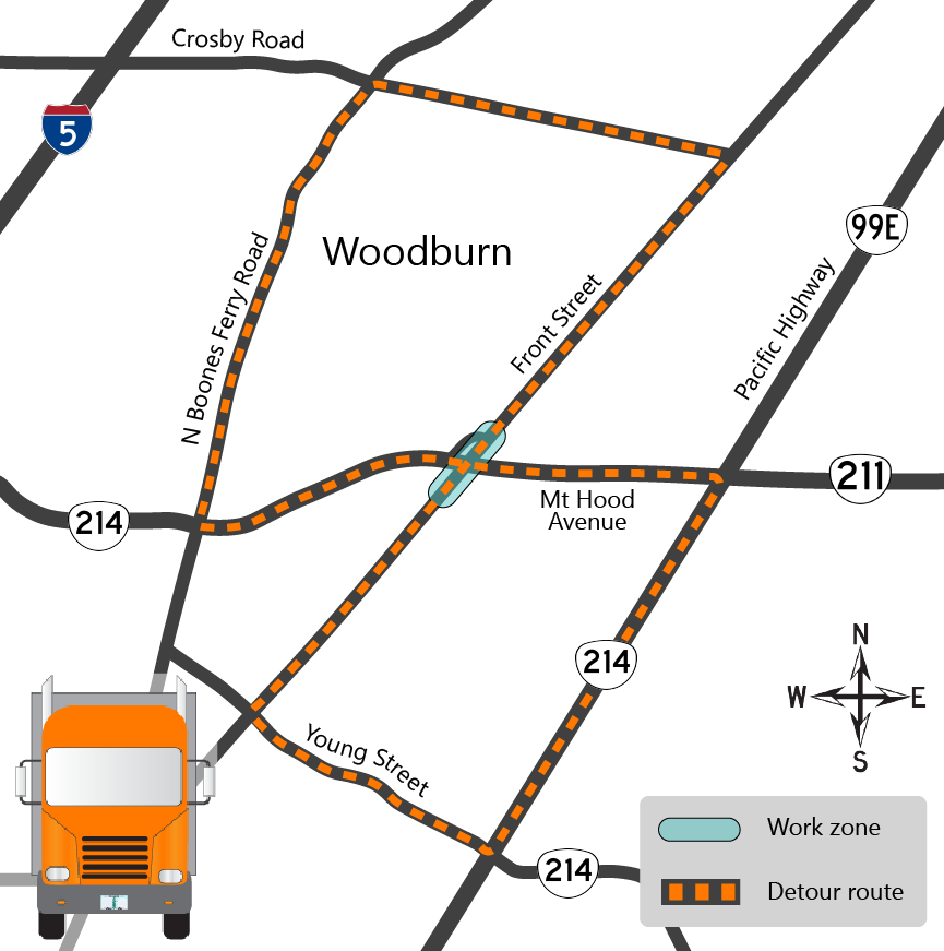 - The N Front Street connector ramp to OR 214 to close to all semi truck traffic during short portions of the project.