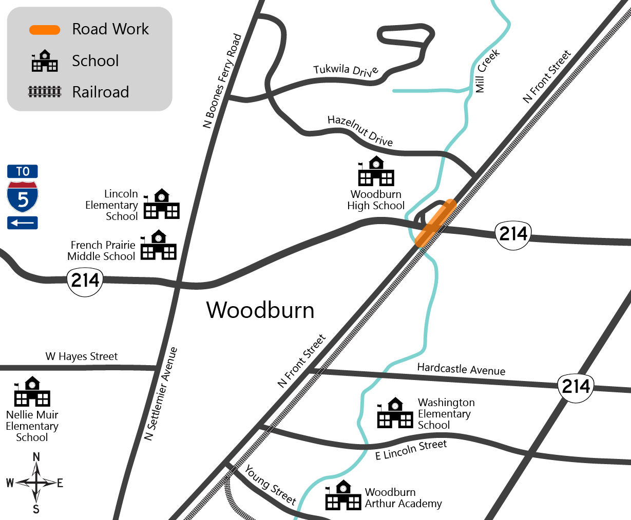 - Northbound traffic on N Front Street can turn left onto Crosby Road NE, left onto Boones Ferry Road and right onto OR 214.