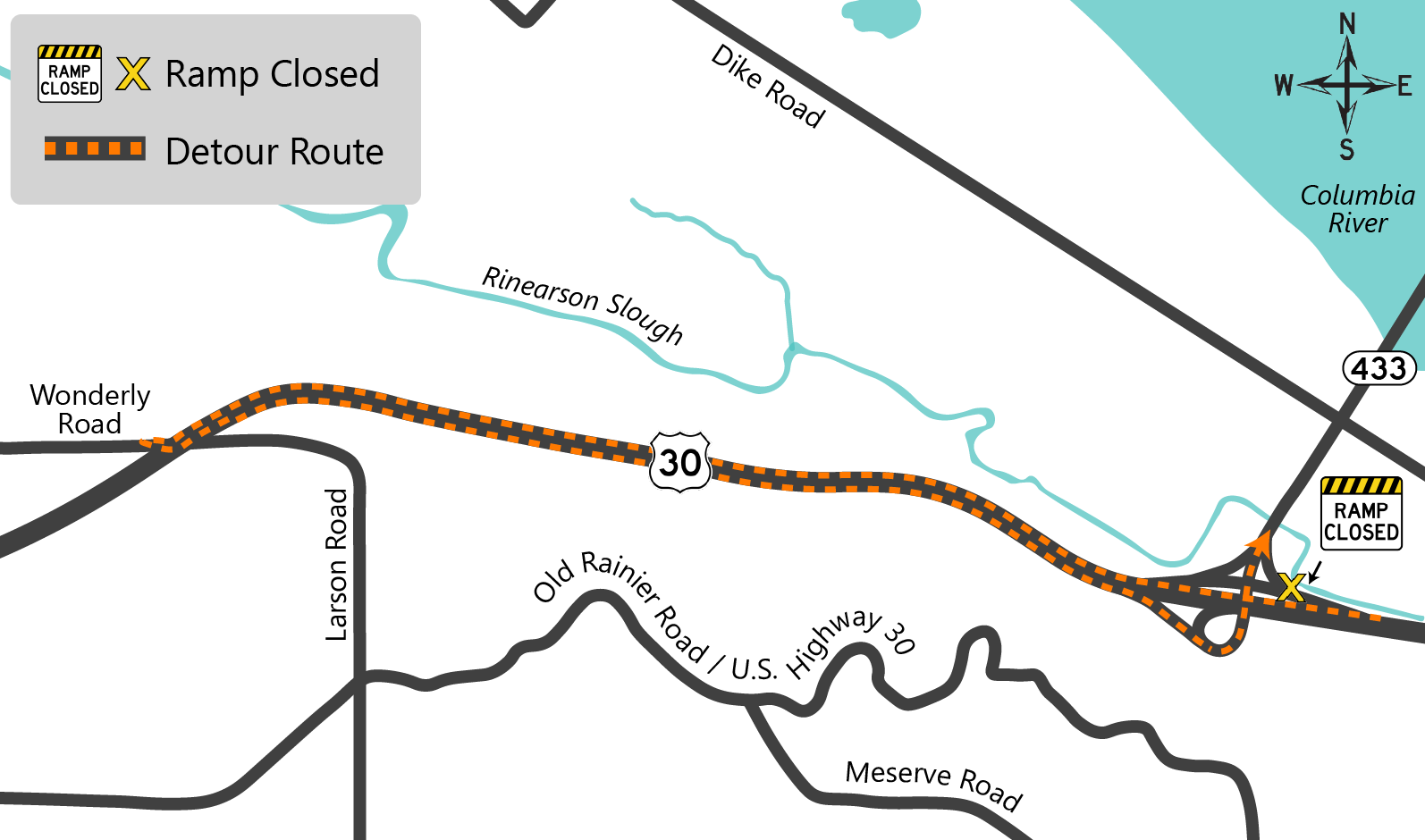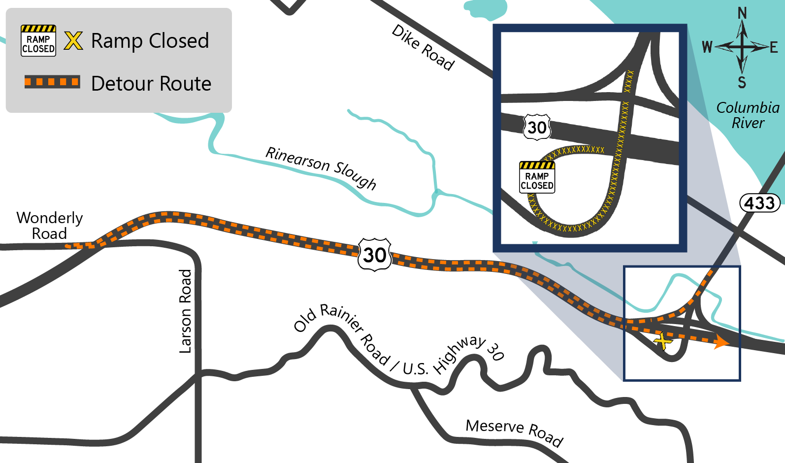During construction, we'll need to close the ramps to and from SR 433 on the Lewis and Clark Bridge. Please follow the signed detours during the ramp closures: