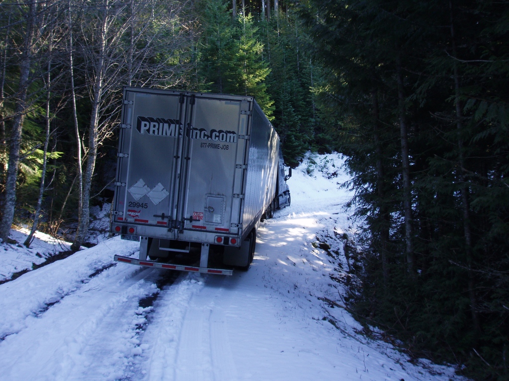 The attached photo shows a semi stuck in the snow on a sharp curve Jan. 16, 2014. The truck is in danger of sliding off the road into the trees.