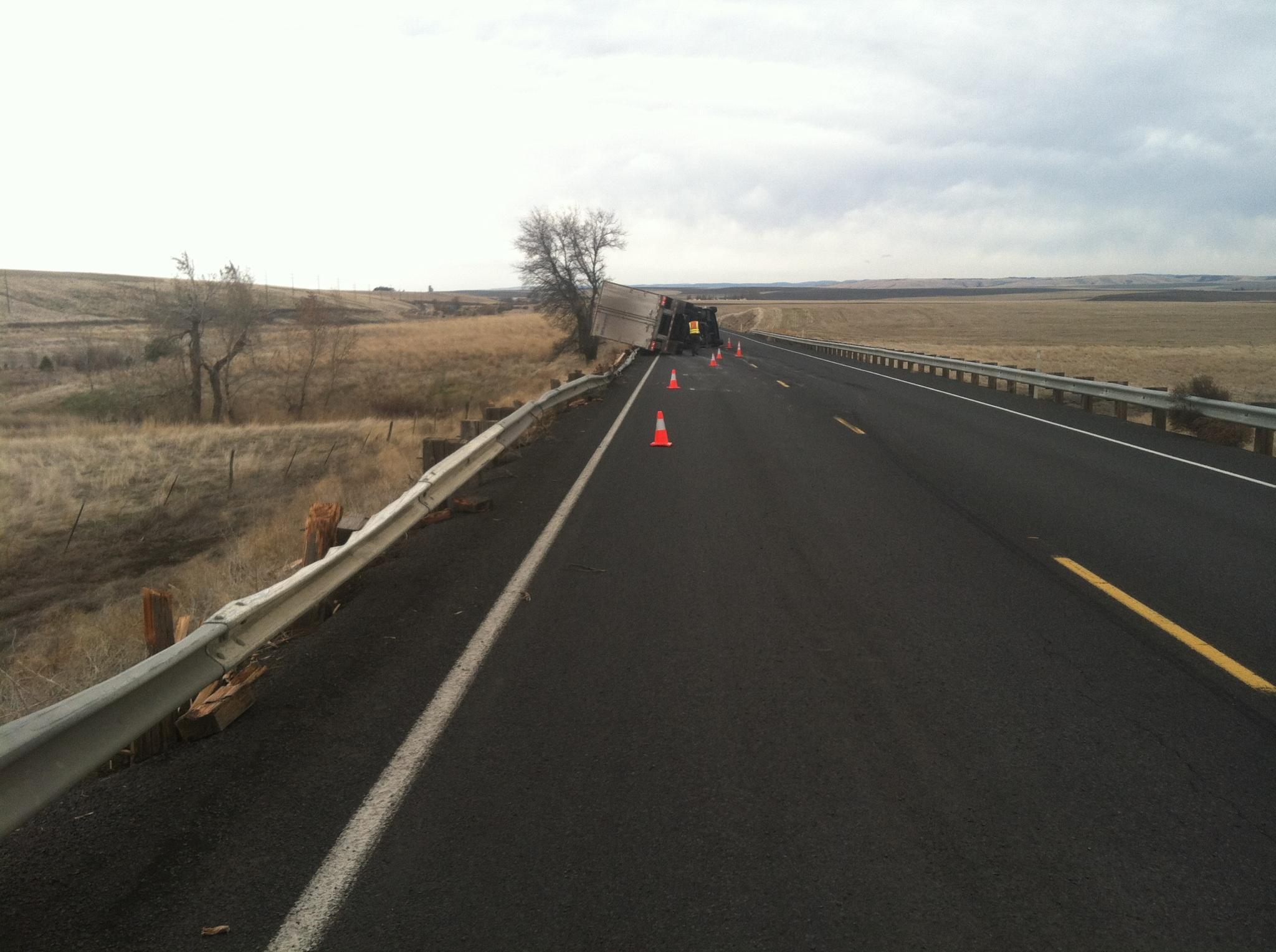 See attached photo of truck that was blown over onto guardrail along OR 11 earlier today.