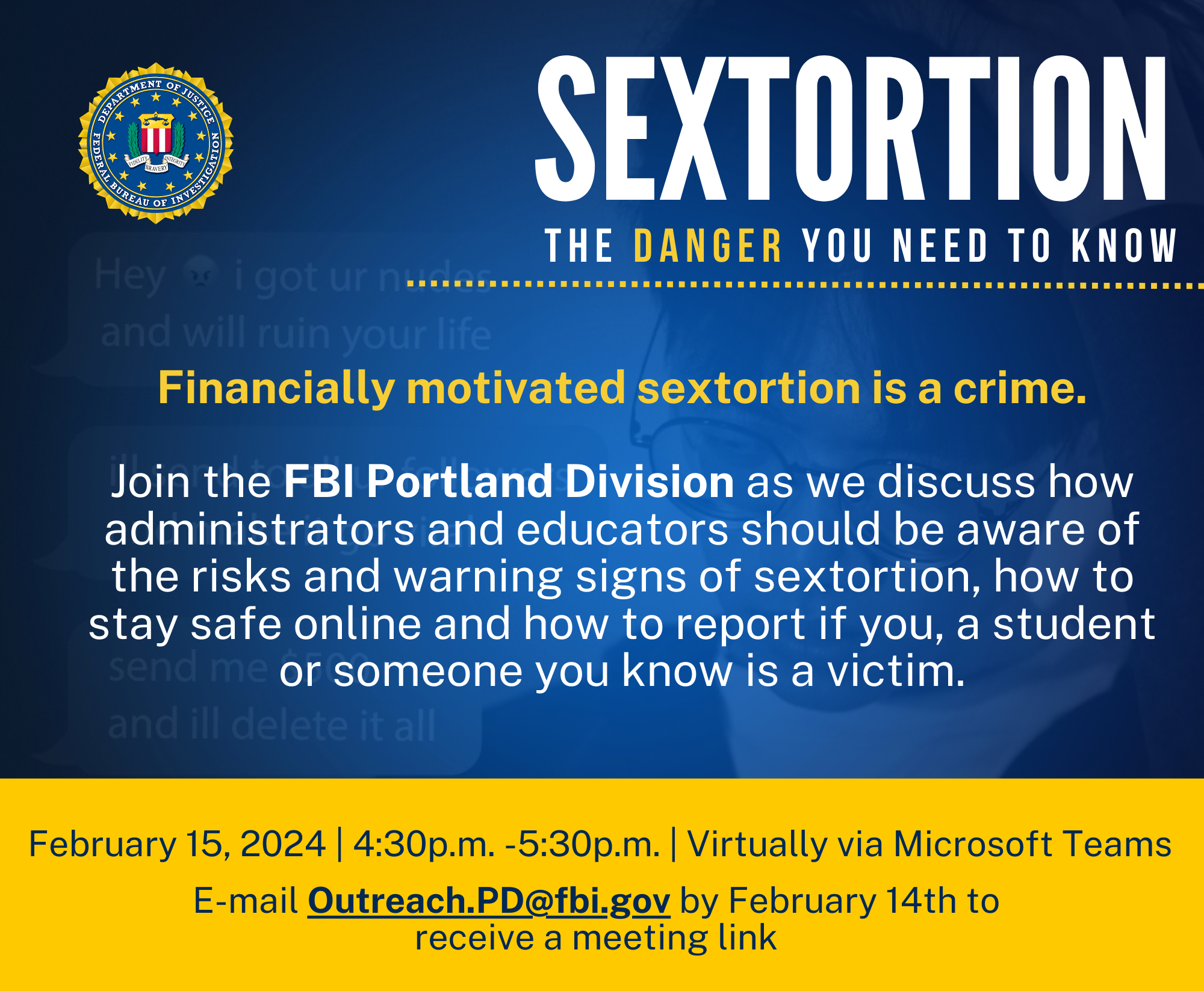 To: Superintendents, Principals, K-12 Public Information Officers, Charter School Leaders, Education Partners From: ODE Communications Team Date: February 9, 2024 Re: FBI Webinars on Financial Sextortion of Minors