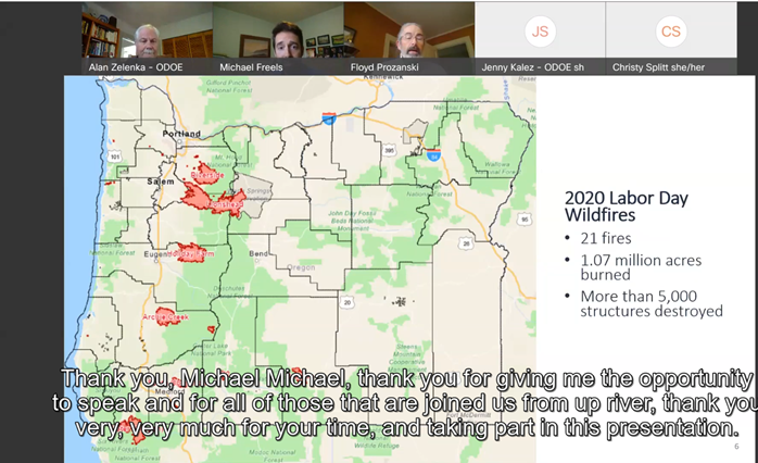 On October 28, I joined the Oregon Department of Energy (DOE) for a virtual public meeting to discuss and inform development of the Energy Efficient Wildfire Rebuilding Incentive. This new program was created by the Legislature to support energy-efficient rebuilding of structures lost during the 2020 Labor Day fires. DOE staff provided and overview and sought feedback from survivors on questions like: