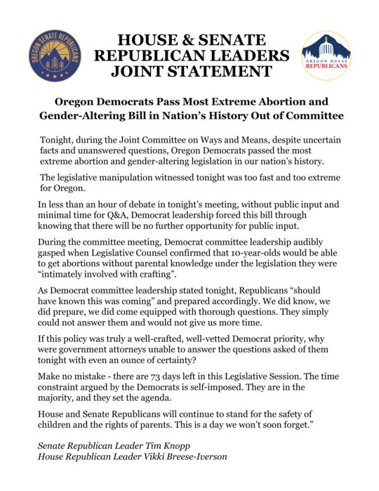 House Republican Leader Breese-Iverson and Senate Republican Leader Knopp issued a joint statement on HB 2002-A making its way out of the Joint Ways and Means Committee. HB 2002-A is the most extreme abortion and gender-altering bill the United States has ever seen.
