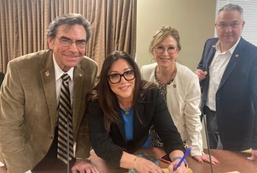 Congresswoman Chavez-DeRemer signs copy of U.S. Constitution with House Representatives Boice, Goodwin, and Diehl.