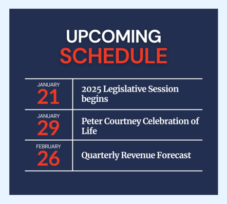 Peter Courtney Celebration of Life (1/29): Peter Courtney was the longest-serving legislator and Senate President in Oregon history. He passed away on July 16th, 2024 at the age of 81. The Oregon Legislature will host a celebration of life for the late Peter Courtney at 2pm and a reception in the Salem YMCA 3rd floor conference room from 4 - 5:30pm. The 2pm event will be held in the Senate chamber and simulcast in the House of Representatives. The Senate will be held for reserved seating only, while the House will be open seating. There will be additional overflow seating available elsewhere in the Capitol. Inquiries regarding reserved seating may be directed to bonnie.allen@oregonlegislature.gov.