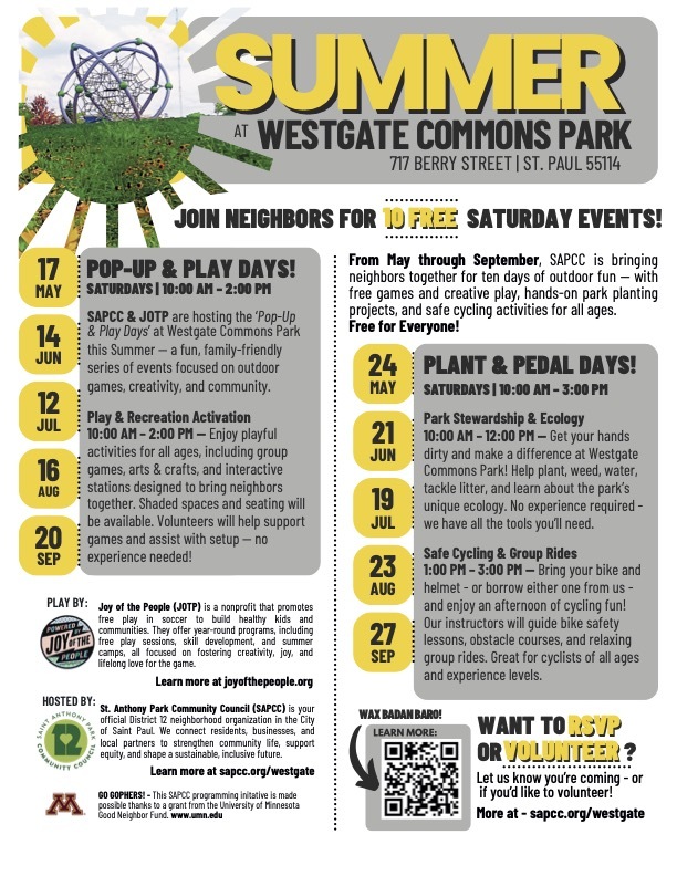 From May through September, Saint Anthony Park Community Council is hosting ten days of outdoor fun! Enjoy free games, creative play, hands-on park planting projects, and safe cycling activities for all ages! More info at https://sapcc.org/events/