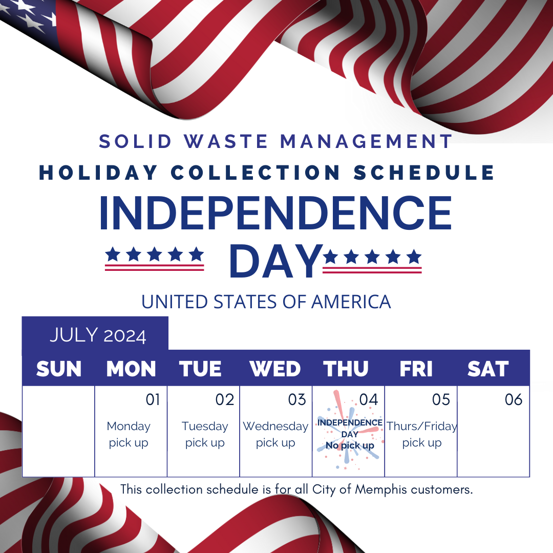 Memphis sent this bulletin at 06/26/2024 03:41 PM CDTThe City of Memphis garbage collection will be delayed due to the July 4 holiday.