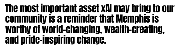 But I think the most important asset xAI may bring to our community is a reminder that Memphis is worthy of world-changing, wealth-creating, and pride-inspiring change.