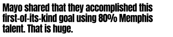 While accomplishing this nearly impossible feat, Mayo has also begun integrating into the fabric of Memphis, meeting with various stakeholders, including school officials, small businesses, and city representatives like our group. I believe this demonstrates the company's interest in understanding and contributing to the needs of our community. Mayo's emphasis on building and preserving the community reflects the company’s dedication to being a responsible corporate citizen.