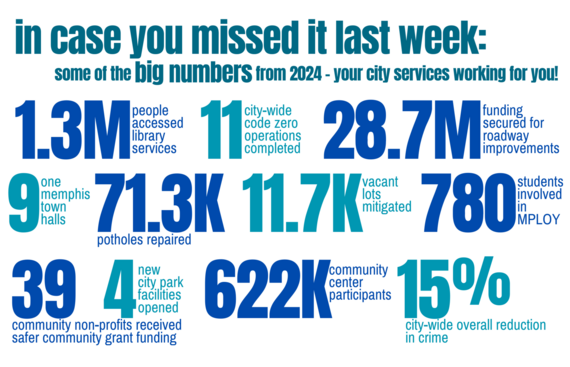 This has been an incredible year, with so many big wins - including an overall 14% reduction in all crime, including reductions in every zip code across our city*. I’ve said it before - the work is working, and I am honored to support our team as they move Memphis forward. As your mayor, I am committed to leading with transparency, integrity, and a focus on continuing to do what is right for our community. Together, let’s resolve to continue building the Memphis we all deserve and let’s make 2025 a year filled with promise and positivity.