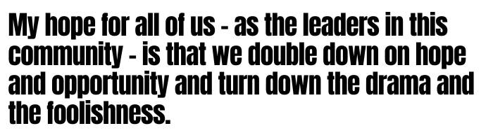 My hope for all of us - as the leaders in this community - is that we double down on hope and opportunity and turn down the drama and the foolishness. We don’t need our city to be a spectacle. Our kids are looking up to us. We have to be the adults in the room. And, no, we're not going to agree on everything. I understand that. But we can dial down the drama and show our kids real leadership.