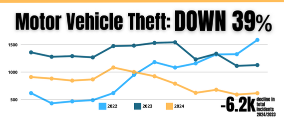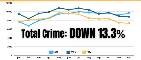 Positive News from the Public Safety Front - In January 2024, I stated that I wanted to achieve an overall 10% decline in crime, and look what we were able to do together! The percentage decreases represent 2024 over 2023: