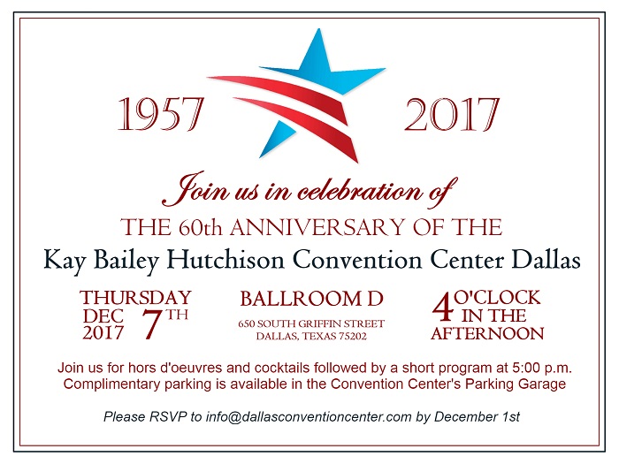 You are invited to the 60th Anniversary of the Kay Bailey Hutchison Convention Center Dallas Thursday, December 7 Kay Bailey Hutchison Convention Center Dallas - Ballroom D |