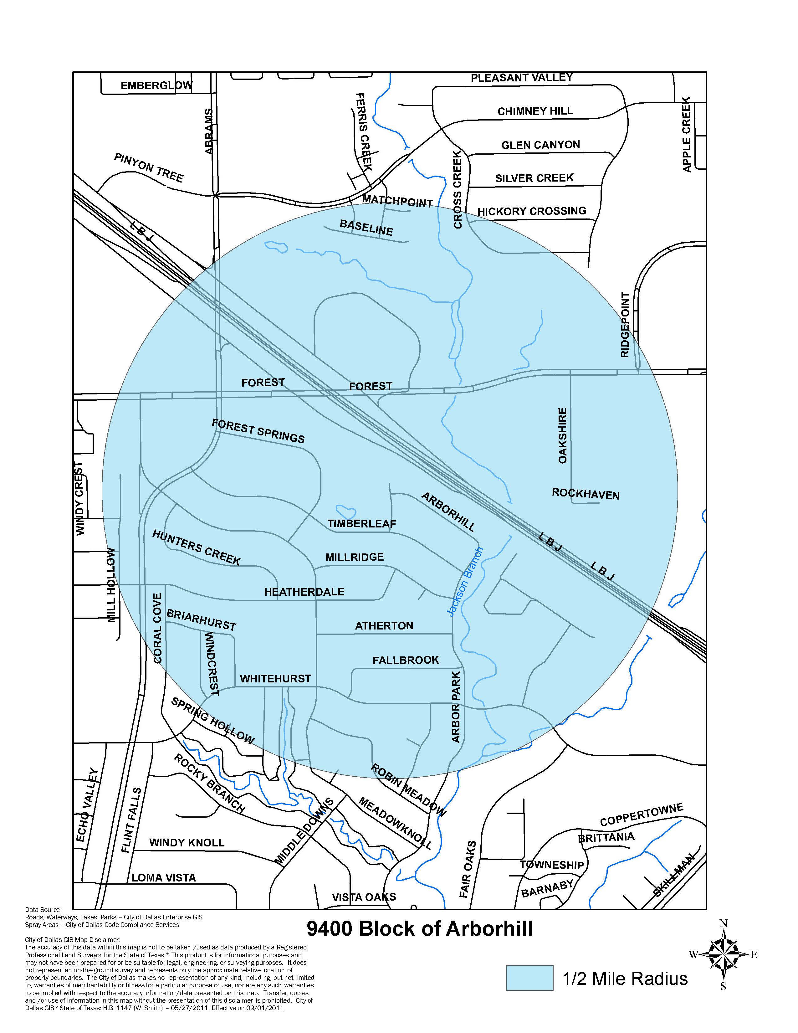 Control Area: The area to be sprayed is within an area generally bounded by: 9400 block of Arborhill Drive 75243: LBJ Freeway on the north, Mill Hollow Drive on the west, W. Ferris Branch Boulevard on the east, and Rocky Branch Drive on the south