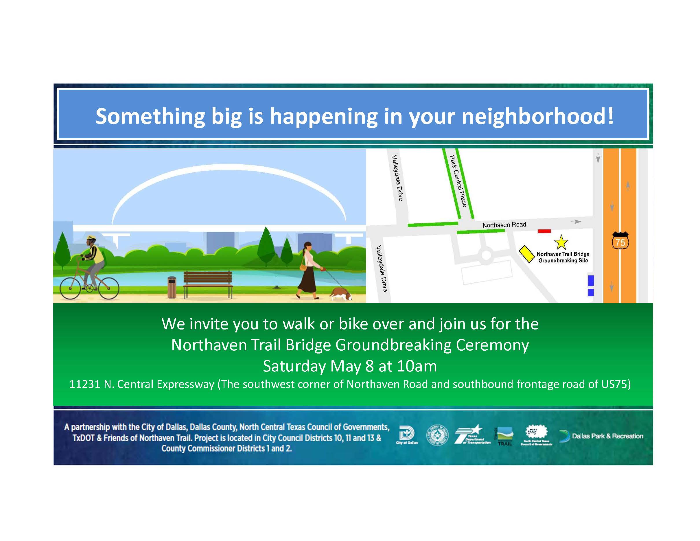 Dallas Mayor Eric Johnson joins state and local officials, community leaders and others at a ceremony to break ground for a pedestrian bridge that, when it opens in 2023, will connect Northaven Trail east of Central Expressway to city trails on Central's east side. The $9.3 million project is a partnership between the City of Dallas, Dallas County, North Central Texas Council of Governments, Texas Department of Transportation and Friends of Northaven Trail. The bridge will be located in Dallas City Council Districts 10, 11 and 13 and County Commissioner Districts 1 and 2.