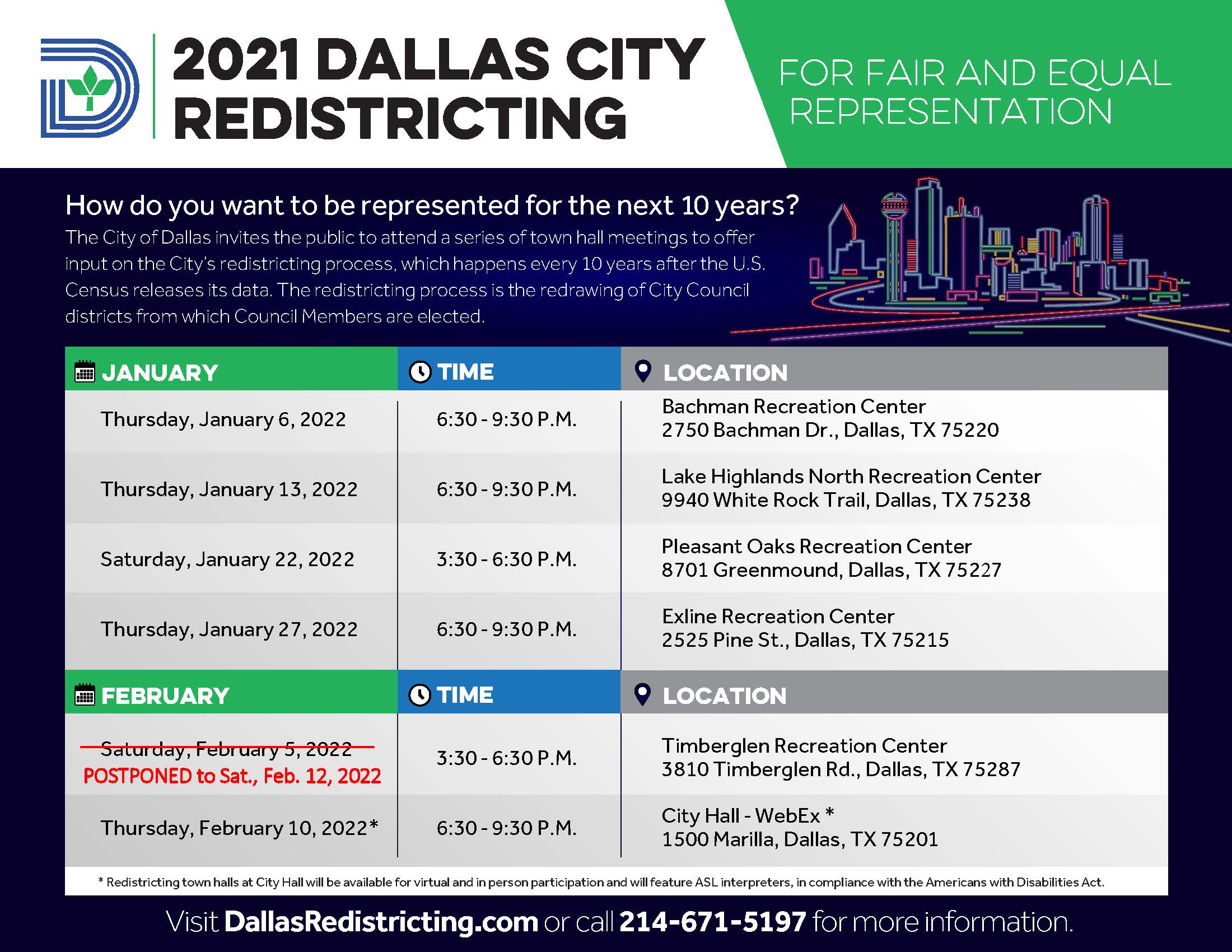 The City of Dallas invites the public to attend the final Redistricting Commission town hall meeting, 3:30 p.m. Saturday, Feb. 12 at Timberglen Recreation Center located at 3810 Timberglen Rd. It was originally planned for Saturday, Feb. 5 but it was postponed due to inclement weather.