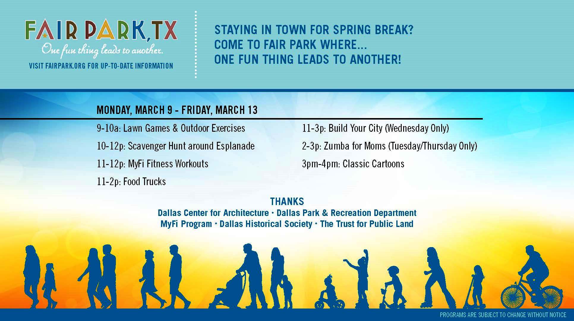 Families staying in town for spring break can participate in a variety of free activities at Fair Park beginning Monday, March 9 and through Friday, March 13.