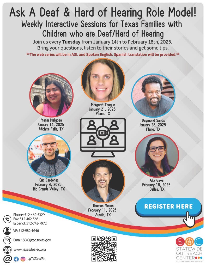 When: Every Tuesday 7:30 - 8:30 p.m. CST from January 14 - February 18, 2025 What: Weekly virtual sessions featuring awesome adults who are Deaf and Hard of Hearing Who: Open to all families with children who are deaf or hard of hearing in Texas Registration Link