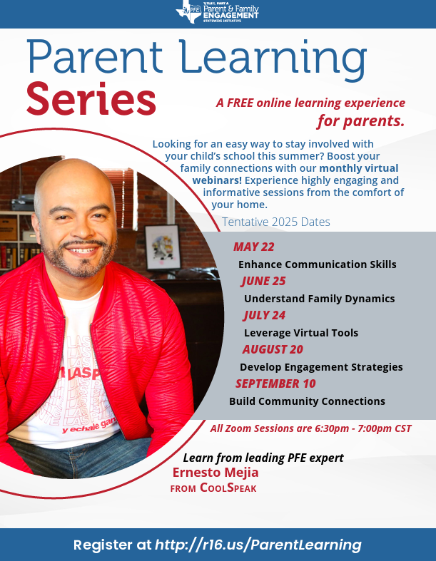Looking for an easy way to stay involved with your child’s school this summer? Boost your family connections with our FREE monthly virtual webinars! Experience highly engaging and informative sessions from the comfort of your home and learn from CoolSpeak’s Ernesto Mejia! All Zoom Sessions are 6:30 - 7:00 p.m. CST.