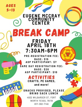 Break Camp, April 18th, 7:30AM-6PM, Eugene McCray Community Center