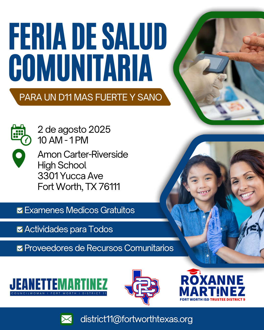 Anoten en sus calendarios el sábado 2 de agosto, de 10:00 AM a 1:00 PM, en la preparatoria Amon Carter-Riverside. Acompáñenme, a la presidenta de la Junta del Distrito Escolar Independiente de Fort Worth, Roxanne Martínez, y a varias organizaciones locales en un día lleno de exámenes de salud gratuitos y recursos para promover estilos de vida saludables.