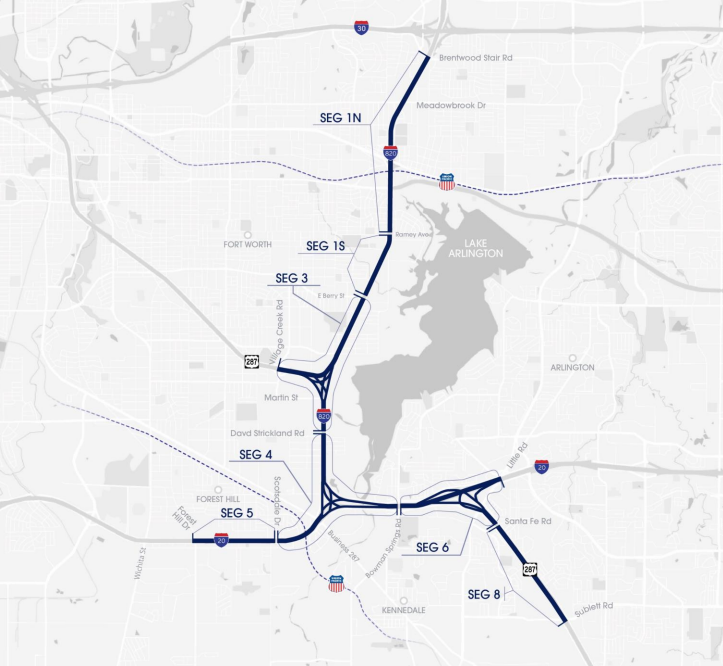US 287 from Bishop St. to Sublett Rd.: Construction of one GPL in each direction. Reconstruction and realignment of existing GPLs, frontage roads, I-820/ US 287 interchange, and ramps. This includes the Deferred Work Component (DWC) #2: US-287 from Village Creek Rd. to Bishop St.